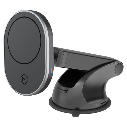 The Mighty Mount MagSafe Magnetic Suction Cup Mount securely holds MagSafe-compatible iPhones with powerful magnets and a strong suction base. It offers easy one-handed operation, 360-degree adjustability, and a firm grip on smooth surfaces like dashboards or windshields.