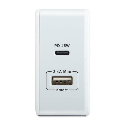 The PD45 Wall Chargers maximize efficiency and power with 57 total watts of rapid recharging. Featuring a 2.4 Amp smart charging port and a dedicated PD45 Power Delivery port, this is a flexible solution for powering up most smartphones, tablets, gaming systems and even laptops. Pick up a quick PD45 Wall charger for your devices today!